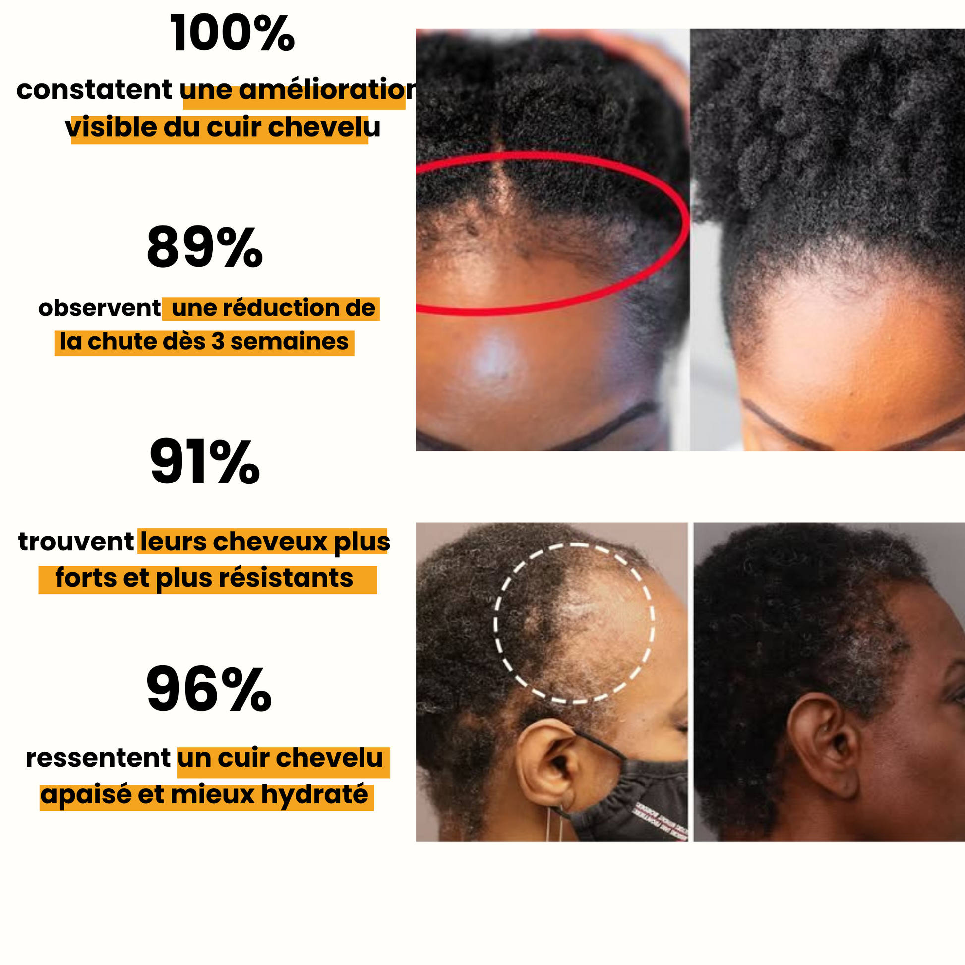 Les premiers effets peuvent être visibles en quelques semaines avec une application régulière. Une utilisation sur 2 à 3 mois offre des résultats spectaculaires sur la densité et la force des cheveux.