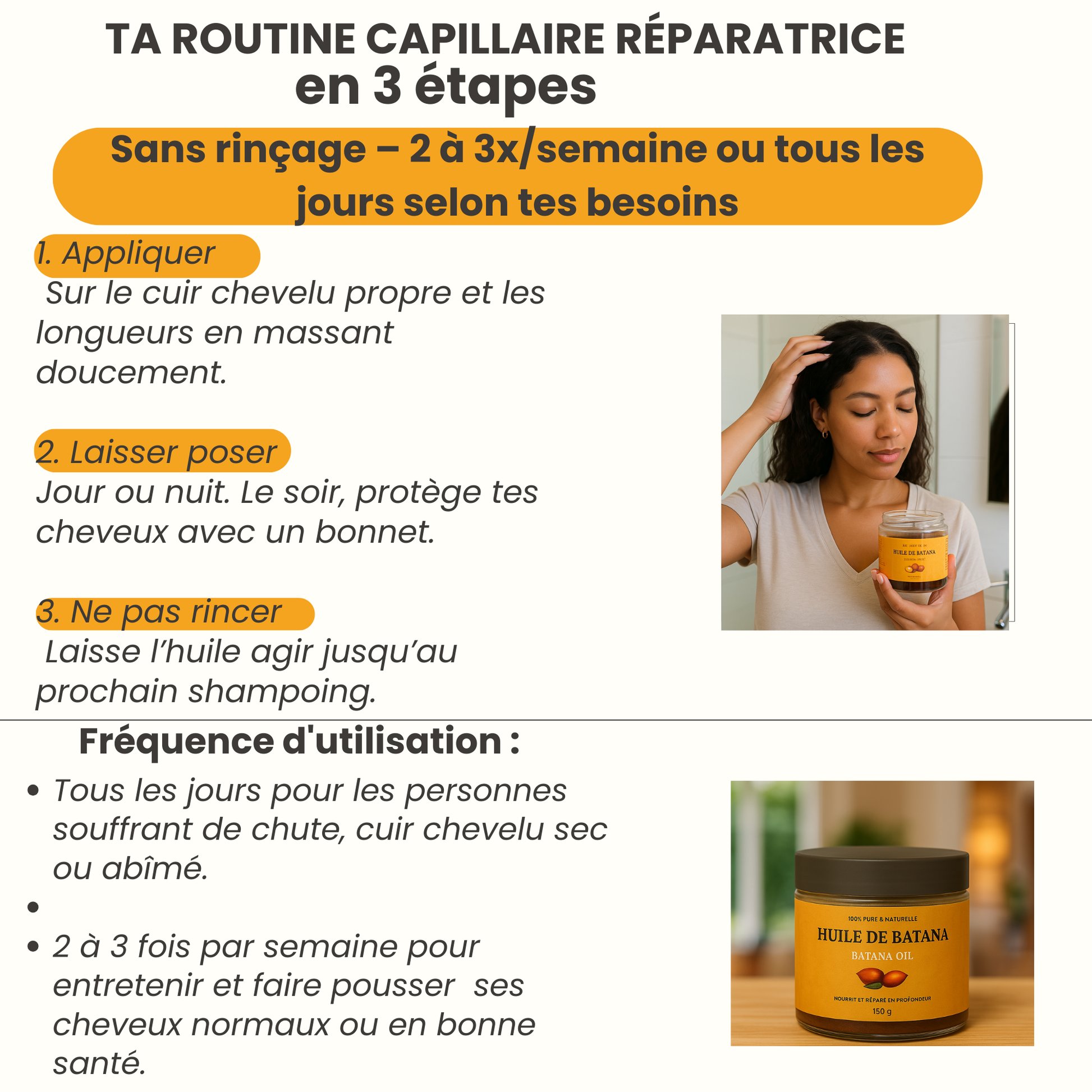 Oui. L’huile de Batana est naturellement riche en oméga-9, oméga-6 vitamine E et antioxydants, ce qui lui permet de freiner la chute à la racine, de renforcer les follicules et de préparer la repousse.